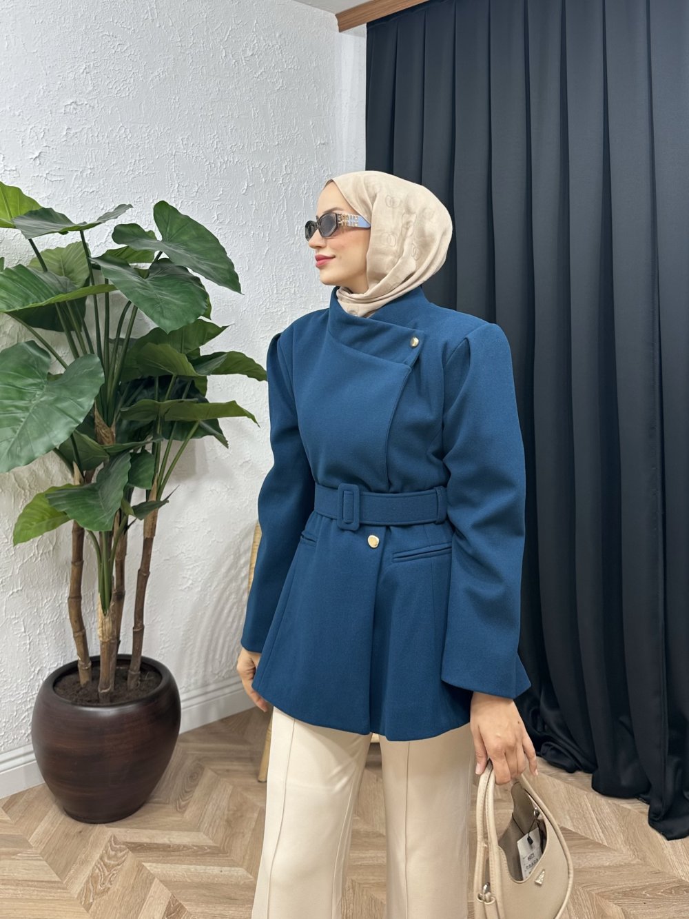 Geniş Yakalı Kaşe Ceket Petrol Mavisi