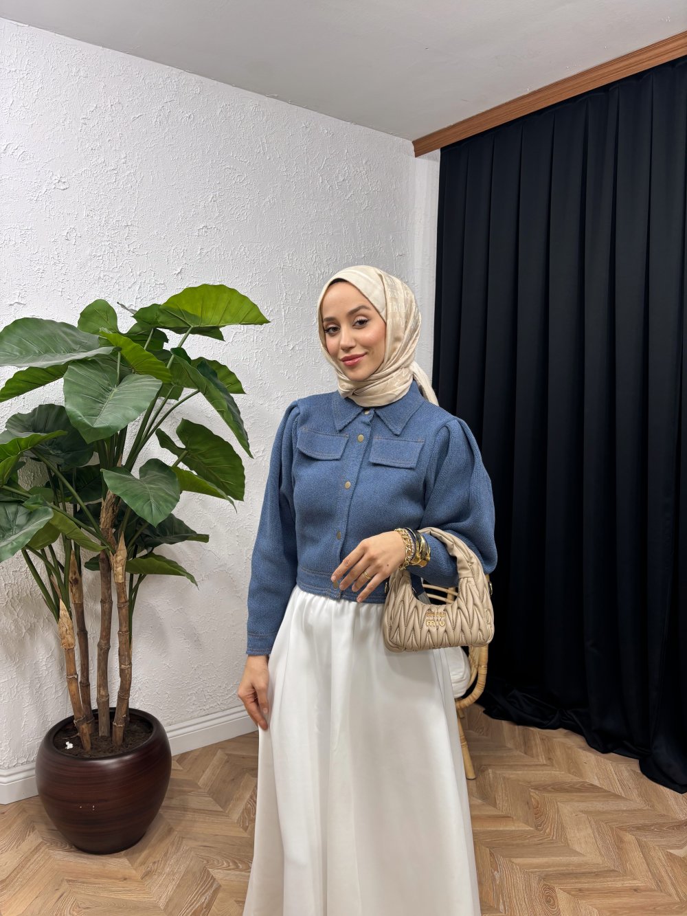 Metal Düğmeli Triko Bomber Ceket İndigo Mavi